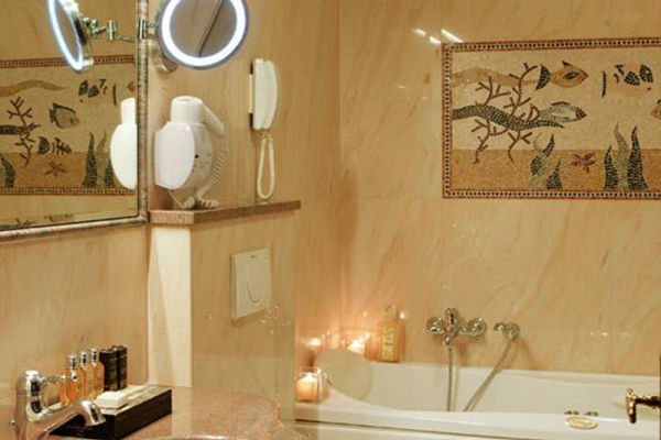 JUNIOR SUITE VISTA LAGO: Camera di circa 25 mq dotata di arredi eleganti, zona giorno con divano, tavolo e sedie, bagno con decorazioni a mosaico e interni in marmo, balcone privato con vista mozzafiato sul Lago Maggiore. Dispone di telefono diretto, minibar, Tv Sat, cassaforte, phon, aria condizionata, wi-fi, accappatoio e pantofoline, prodotti da bagno in omaggio.