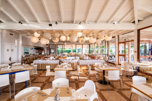Ristorante con servizio a buffet e sala interna e esterna, pizzeria (a cena, su prenotazione). Intolleranze: per gli ospiti con intolleranze alimentari (glutine/lattosio) sono disponibili prodotti base confezionati (pane, pasta, biscotti senza glutine e/o lattosio, gelato senza lattosio). I clienti potranno integrare portando con sé prodotti confezionati a propria scelta. È sempre necessaria la segnalazione di eventuali intolleranze alimentari in fase di prenotazione. La struttura non dispone di una cucina separata per la preparazione di pasti senza glutine, pertanto non può essere garantita l’assenza di contaminazione se non dei prodotti acquistati già confezionati. Servizio Pappe e Mamme: durante l'orario dei pasti, il personale sarà a disposizione per la preparazione di pastine, brodi vegetali e di carne, passato di verdure, salsa di pomodoro. Per agevolare il servizio, la sala potrebbe essere accessibile anche prima dell'orario di apertura. All inclusive La formula prevede pensione completa (colazione, pranzo e cena) con bevande incluse ai pasti (distributori automatici per acqua, cola, aranciata, vino bianco e rosso). Dalle ore 10:00 alle ore 23:00 bevande al bicchiere: acqua naturale, gasata, cola, aranciata, limonata, cappuccino, caffè americano, vino bianco o rosso e, inoltre, presso il bar birra alla spina, gin, rum, limoncello, amaro, vodka, spritz e prosecco al bicchiere e una selezione di 5 cocktail con le bevande a disposizione, aperitivo con sangria dalle ore 18,00 alle ore 19,00, snack presso il bar dalle ore 17,00 alle ore 18,00. A pagamento: alcolici e superalcolici nazionali ed esteri, cocktail non specificati, bibite in bottiglia o lattina, gelati, snack e tutti i prodotti confezionati. Tutto quanto non previsto o indicato nel trattamento. La scelta delle marche delle bevande è a discrezione della Direzione.